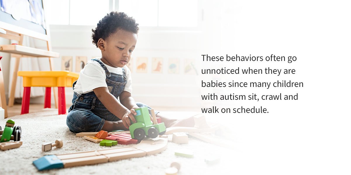 Children with ASD may have language delays, behavioral differences or sensory sensitivities. These behaviors often go unnoticed when they are babies since many children with autism sit, crawl and walk on schedule. Be sure to monitor social and communication skills, as children with ASD can show delays as babies through gestures, learning to smile and making eye contact.